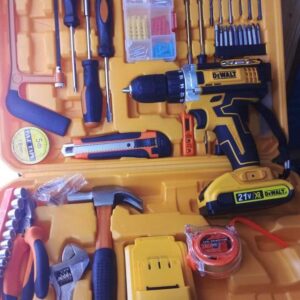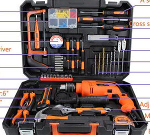 1 pc 680w impact drill (220-240v ~ 50/60hz, 13mm key chuck) 1 pc 8 oz. claw hammer 1 pc sl5.5 * 100 screwdriver 1 pc ph1 * 100 screwdriver 1 pc 7′′ combination pliers 1 pc 6′′ adjustable wrench 1 pc steel measuring tape, 3m 1 pc snap-off blade knife, 9mm 1 pc test pencil 1 pc magnetic bits holder 1 pc pvc insulation tape 5 pcs twist drill bits (2, 3, 4, 5, 6mm) 5 pcs masonry drill bits (4, 5, 6, 8, 10mm) 4 pcs wood drill bits (4, 5, 6, 8mm) 6 pcs screwdriver bits (ph1, ph2, sl4, sl6, t20, t25) 40 pcs screws (20 pcs * st3.5, 10 pcs * st4, 10 pcs st5) 40 pcs plastic plugs (20 pcs * 5mm, 10 pcs * 6mm, 10 pcs * 8mm) 10 pcs screwdriver bits (ph0, ph1, ph2, ph3, pz0, pz1, sl3, sl4, sl5, sl6)